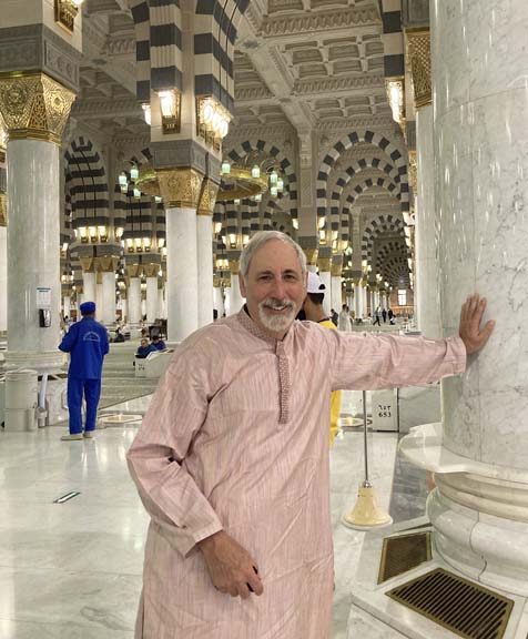 The hotel lobby displays a continuous feed from the Mosque. Luckily, we have met a Saudi friend from Ridyadh who invites us to join him for afternoon prayers. (Devout Muslims pray five times a day.) In an attempt to blend in, I don a shalwar kameez that I brought from Pakistan and join the throngs streaming in. Most the attendees are pilgrims from various Muslim countries. I try to look inconspicous as thousand of worshippers stand, kneel, and bow in unison