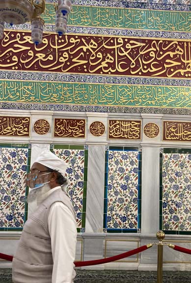 We then join the queue for a “Prophet Visit”, consisting of filing by Muhammed’s tomb. The line is kept moving to prevent anyone (i.e. Shiites) from stopping to pray — the Sunnis are quite adamant against praying to a man. On the other side of the tomb is the Noble Rawdah, a small courtyard where Muhammad used to pray.