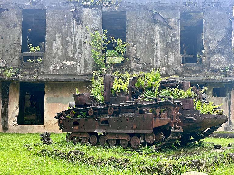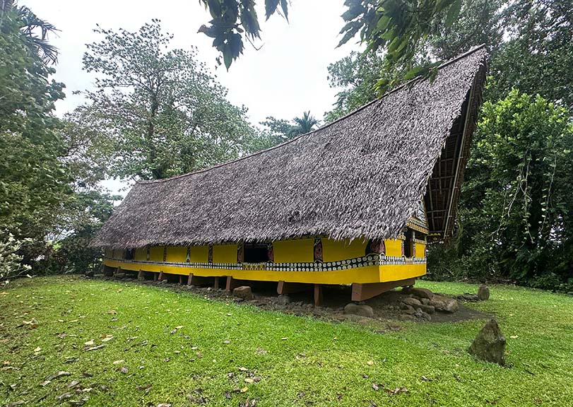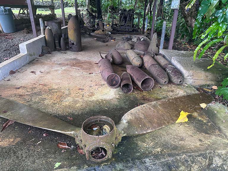 Outside the museum is a reconstructed traditional meeting house and a pile of rusted Japanese military hardware.