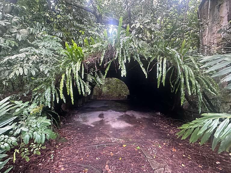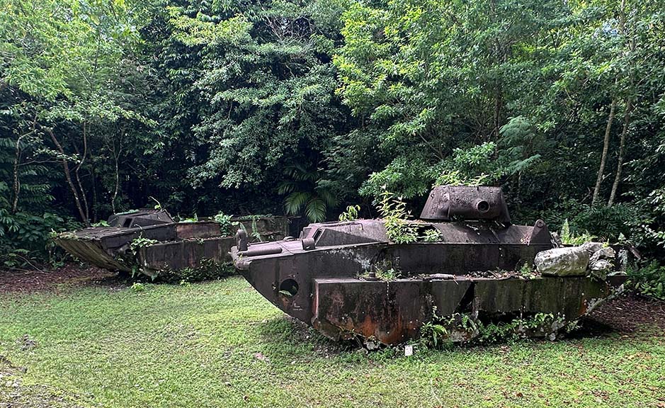 On the way back we pass by a cave that served as a refueling station for Japanese seaplanes. Rusted fuel barrels and an anti-ship cannon.