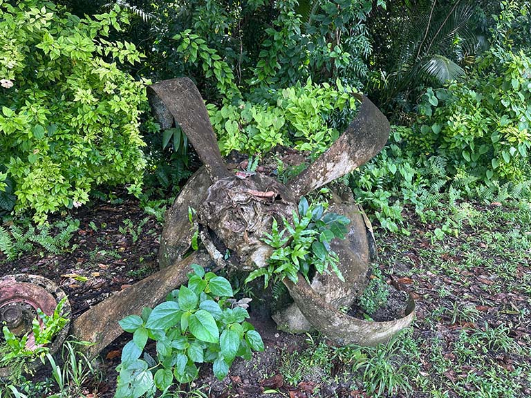 Today, the two by five mile island has about 500 inhabitants. Now covered by dense jungle; after the battle there was not a tree standing. A crashed Japanese Zero fighter plane.
