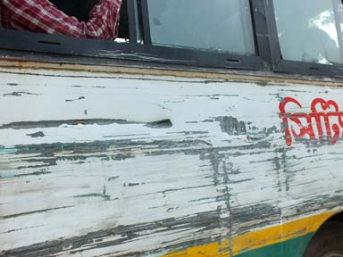 The drive back to Dhaka takes even longer. Traffic is horrific and completely chaotic. It’s like bumper cars: trucks and buses are completely banged up from constant sideswiping and scraping – when it happens, no one stops or even looks. In addition, Dhaka has a half-million tricycle rickshaws and tens of thousands of "CNGs", caged, motorized tricycle scooter-taxis fueled by compressed natural gas.