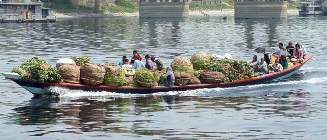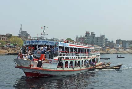 I’ve got two more days. I inquire about visiting Siliguri in the hill country but am advised the security situation (i.e., political turmoil and roadblocks) makes the attempt inadvisable. I investigate flying to Cox’s Bazaar, a resort area boasting the longest beach in the world, but inconvenient airline schedules render that option undesirable. The guide who took me to Sonargaon offers to accompany me gratis for a ferry jaunt– he is doing it just for the experience of working with a western tourist (in the unlikely event that he gets another) – so I take him up on that.